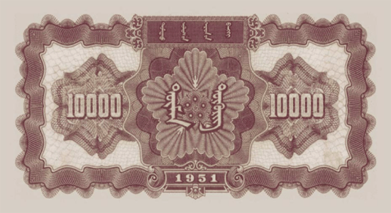 Ар талд нь Хятадын ардын банкны нэр болон нэрлэсэн үнэ цэнийг монгол бичгээр хэвлэсэн, зөвхөн Өвөр Монголд гүйлгээнд байсан тул маш ховор.