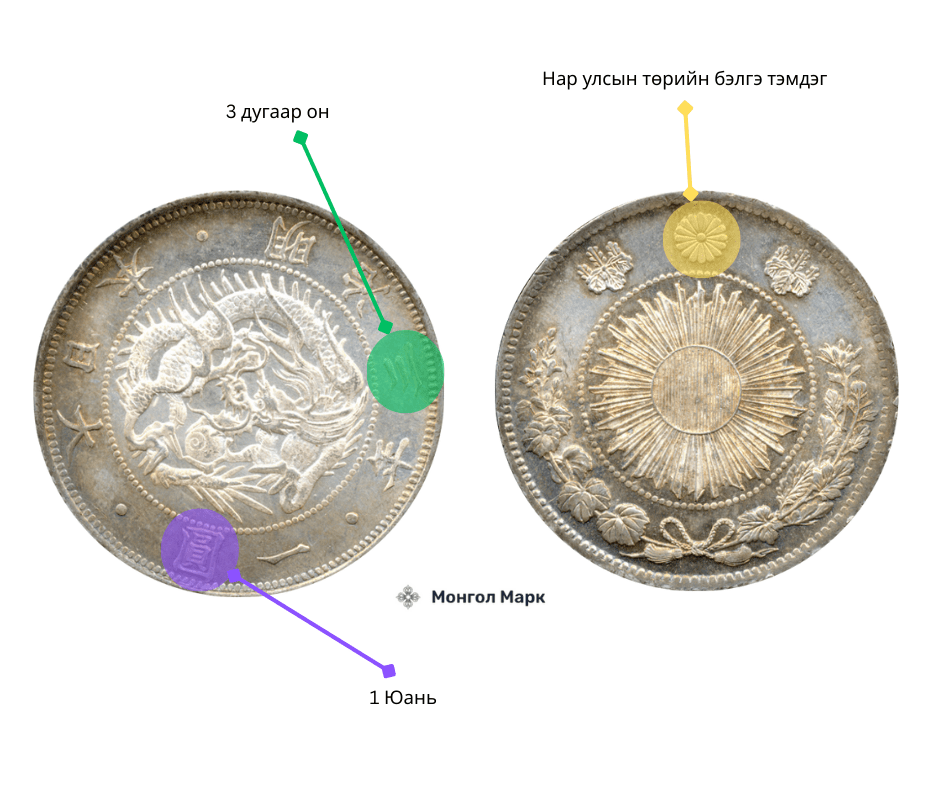Мэйжигийн 3-р оны (1870) мөнгөн иен нь Японы хамгийн ховор зооснуудын нэг боловч Хятадын олон ховор зоостой харьцуулахад үнэ нь харьцангуй боломжийн тул Монгол цуглуулагч та нэгийн олоод хадгалсан байхад илүүдэхгүй дээ.