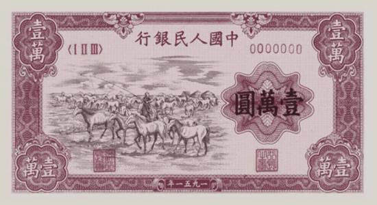 БНХАУ-ын анхны цуврал дэвсгэртүүд дундах 10,000 юанийн “Мал Маллах (牧马)дэвсгэрт нь нилээн сонирхолтой түүхтэй дэвсгэрт юм. Энэхүү дэвсгэрт нь зөвхөн